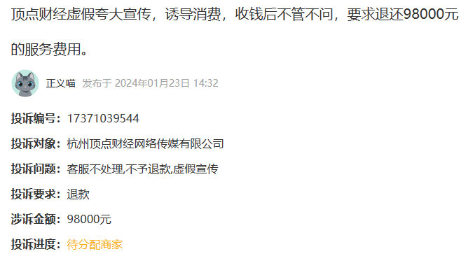 我是今年10月13号在顶点财经公司交了98000元的高额费用,目前还在服务期内。1、杭州顶点财经公司采用虚假夸大暗示误导的营销,诱导我缴费,宣传说的都是涨停,赚钱的。误导我让我以为加入他们就能轻松赚钱,把极少数案例成功案例,宣传成大概率普遍现象进行误导利诱,这是违反消费者权益保护法经营者不得虚假夸大宣传,2、实际的服务很差,没有任何质量,根本不符合98000元的价值,服务没有严格的依据,调研,在他们的随意指导下,导致我损失十几万元。3、联系我的业务员没有名字和执业编号,安排没有资质人员服务,本身就是违规的。4、没有任何回访和改善服务的措施,钱交了以后,就不怎么管了,完全把我当做韭菜。经营的态度和服务是有重大问题的。5、我提出退款,公司没有任何联系,就是拖延时间,不想退还我的费用,请黑猫平台帮助曝光,以及帮我挽回我98000元的损失。谢谢