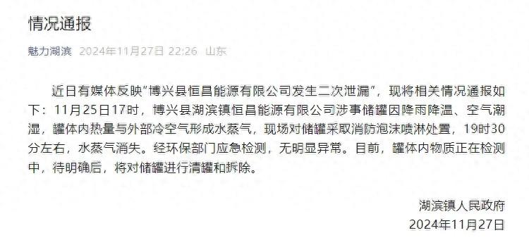山东滨州一工厂发生二次泄漏?官方通报:无明显异常