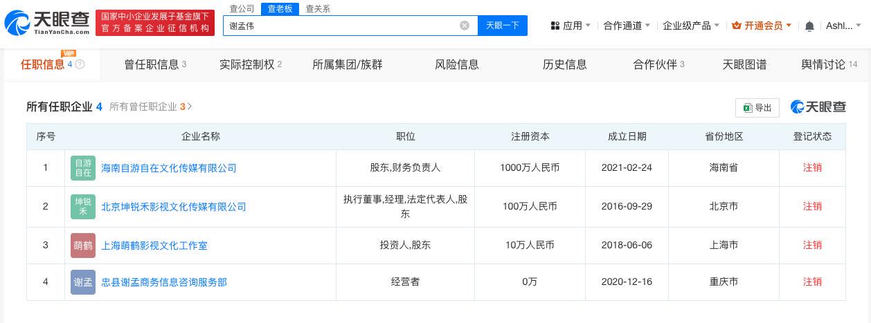 天眼查App显示,谢孟伟共关联4家企业,目前均为注销状态,包括海南自游自在文化传媒有限公司、北京坤锐禾影视文化传媒有限公司、上海萌鹤影视文化工作室和忠县谢孟商务信息咨询服务部。