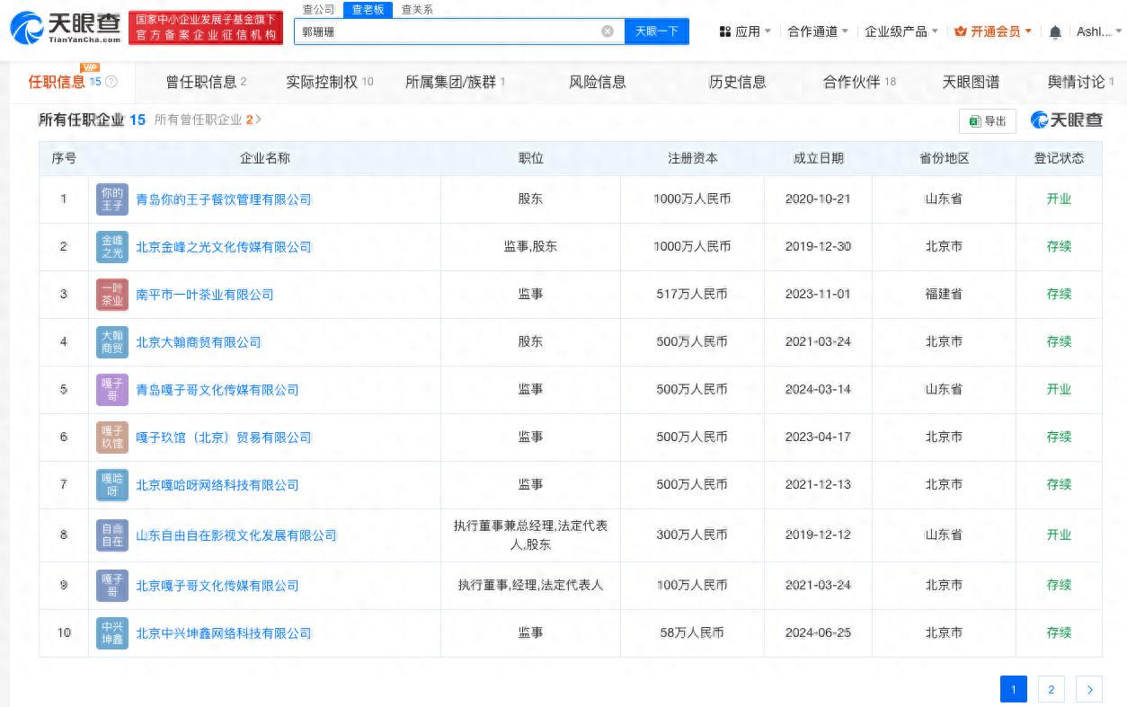 值得一提的是,谢孟伟的妻子郭珊珊名下关联15家企业,其中12家为存续状态,包括北京嘎哈呀网络科技有限公司、北京嘎子哥文化传媒有限公司、山东自由自在影视文化发展有限公司等,郭珊珊在上述公司担任法定代表人、执行董事、经理、股东等职务。