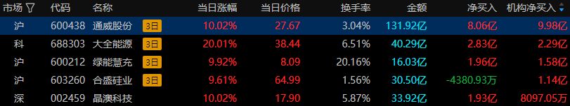 板块上,光伏概念股上演涨停潮,隆基绿能、通威股份、TCL中环、爱旭股份、晶澳科技、钧达股份、大全能源等10余股涨停。