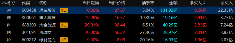 10月25日龙虎榜资金数据分析,龙虎榜资金净买入前五分别是通威股份、旗天科技、大全能源、深城交、绿能慧充,资金分别净买入8.06亿元、2.91亿元、2.83亿元、2.31亿元、1.96亿元,龙虎榜资金榜首光伏设备个股通威股份。