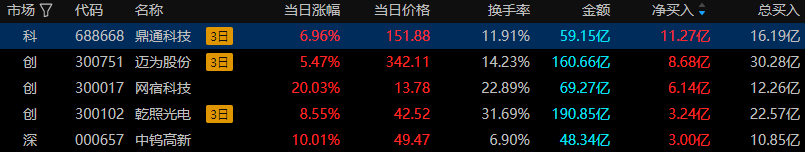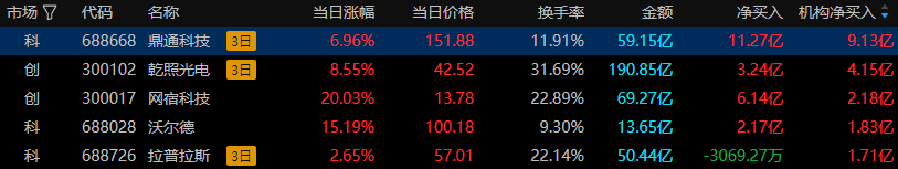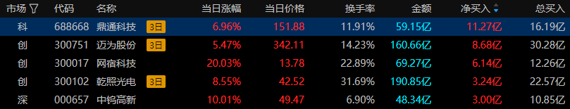 ①鼎通科技(688668),昨日拔得龙虎榜资金头筹,所属板块:通信设备,资金净额买入11.27亿元,机构买入明显。上榜原因:连续3个交易日内收盘价格涨幅较基准指数偏离值累计达到30%的证券。股价异动:鼎通科技昨日收涨6.96%,连续三日放量。