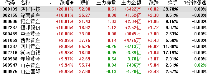板块上,贵金属全线爆发,湖南黄金、四川黄金、白银有色、、招金黄金等多股涨停。消息面上,现货黄金首次突破5000美元/盎司。上期所沪银主力合约触及涨停,报28226元/千克,现涨幅为17.0%。