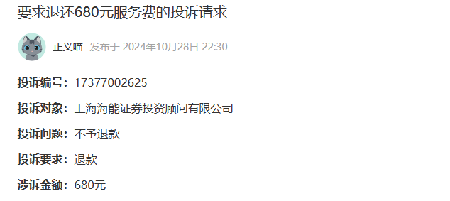 2024年10月28日海能投顾的客股汪梦唯多次在微信上发股票涨停虚假信息引诱我出680元的服务费,后我于下午17:45分43秒用微信转账680元,在晚上18:14分,她推荐我加一位叫何少斌的海能首席助教微信,但此人一直未加我,我感觉服务一点也不好,与宣传不一致,现我申请原路退回服务款680元。
