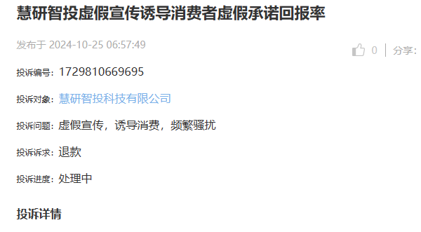 慧研智投服务费可以退款吗?可以退款的,虚假宣传诱导消费者虚假承诺回报率