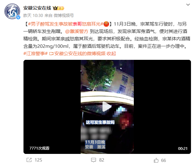 11月3日晚,宗某驾车行驶时,与另一辆轿车发生剐蹭。安徽省淮北市濉溪警方到达现场后,发现宗某浑身酒气,便对其进行酒精检测。