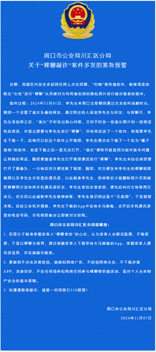 “未经住诱惑便打开了摄像头”,周口发布“裸聊敲诈”案件多发的紧急预警